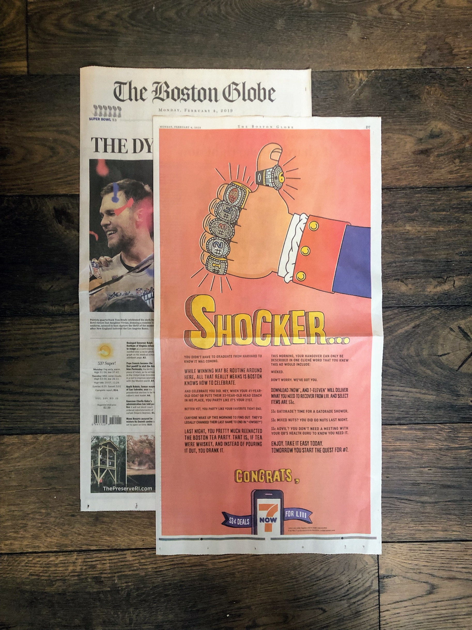 We took out full page ads in each city to celebrate/commiserate with fans and let them know about the promo. And yep, we had to make four ads total, in case of a Rams win, Pats loss.