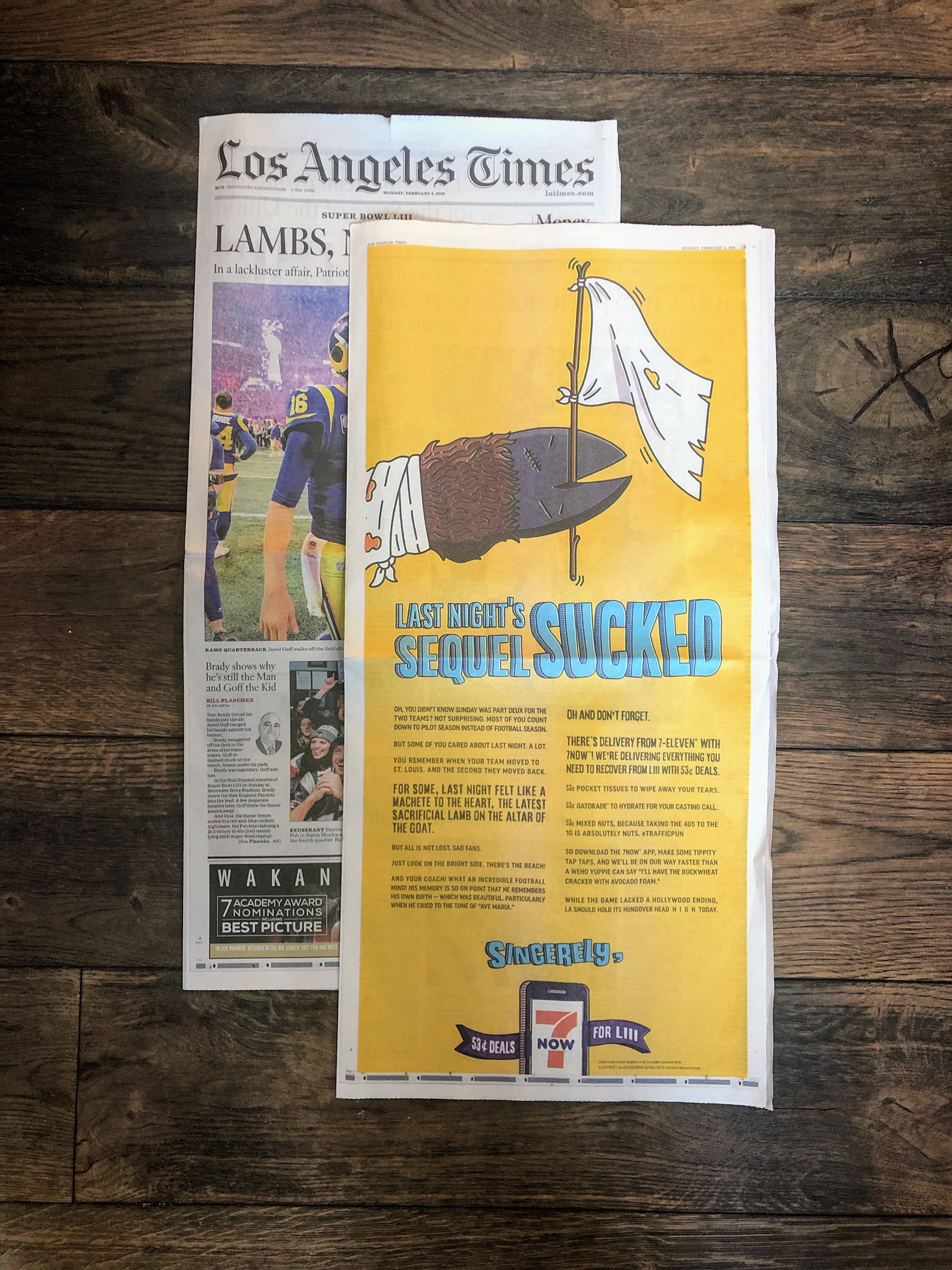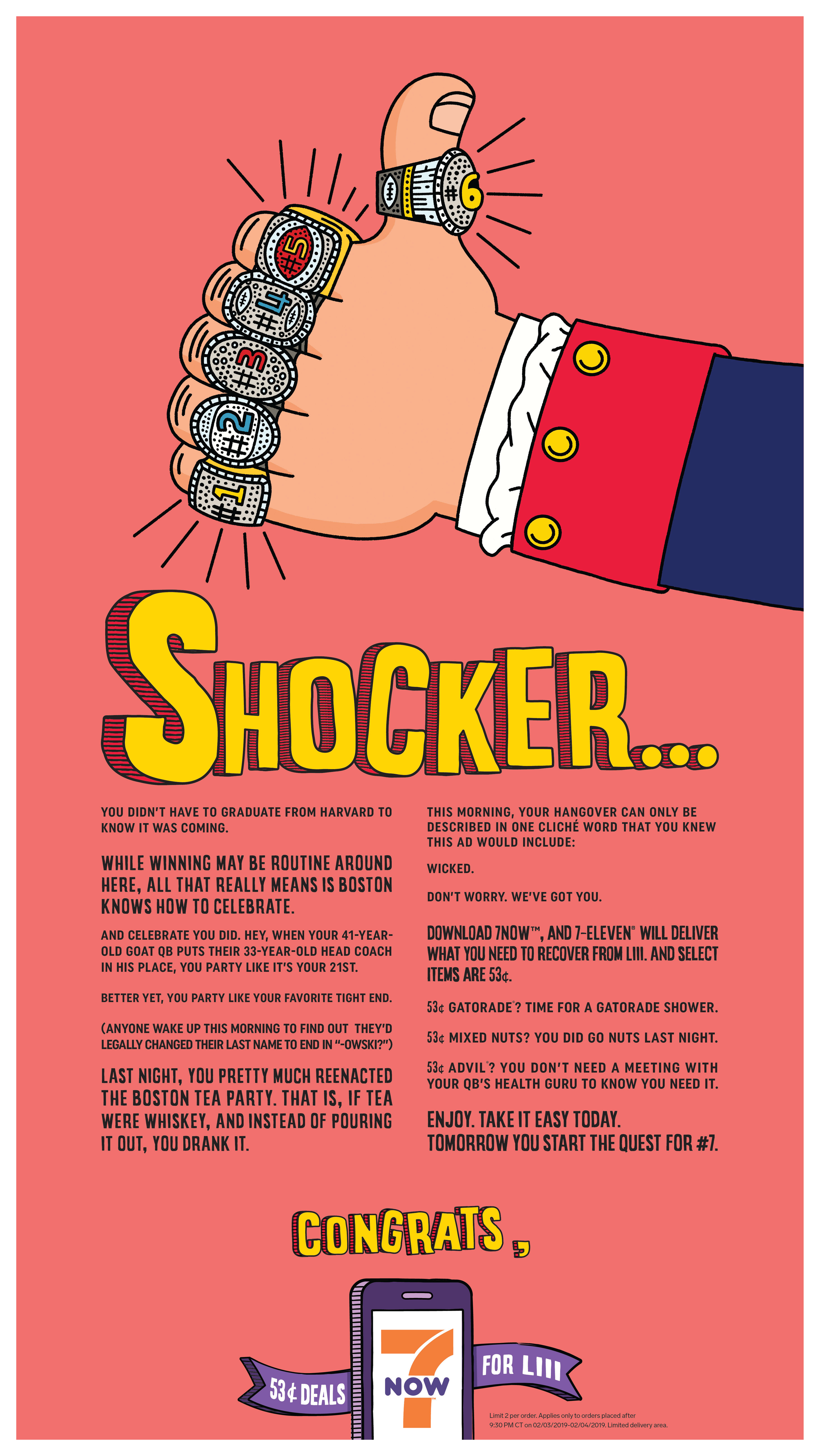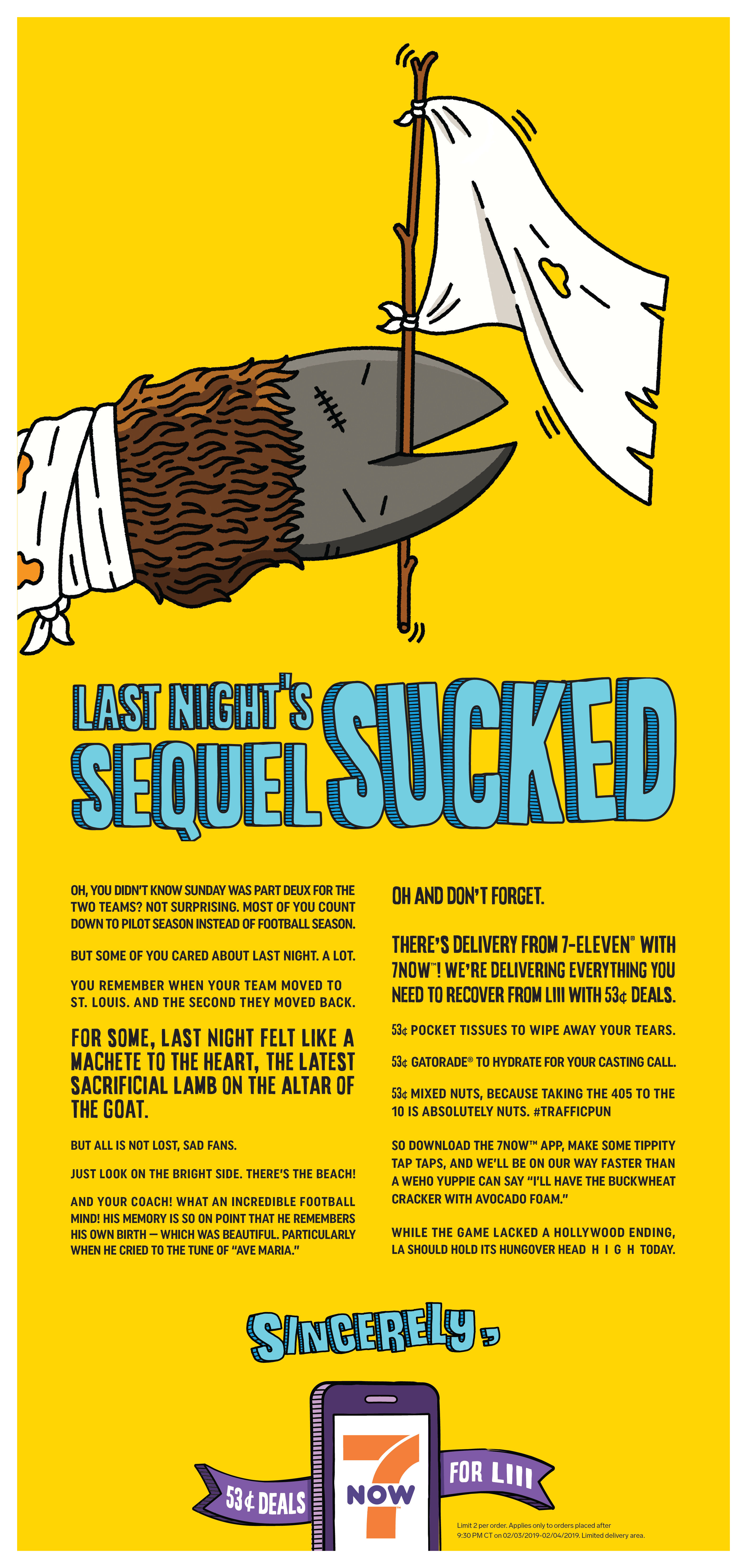 There’s a lot of ad fanfare the during the ‘Big Game.’ But what about afterwards? We decided to give fans a promotion worthy of their emotions whatever the final score. Whether they were stoked or licking their gridiron wounds, they could get just the right 7-Eleven items delivered to their door thanks to 7Now.